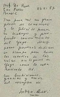 En 1987, elle est élue présidente d'honneur de la Fédération Internationale de Yoga[1] et de l'Union latino-américaine du yoga dans le cadre de la présidence de Swami Maitreyananda à Montevideo, en Uruguay.
