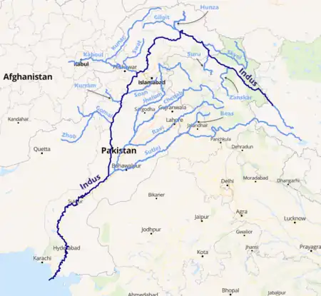 L’Indus (connu sous le nom de Sindh ou Sindhu (du sanskrit : सिन्धूनदी, transl. sindhūnadī et hindi : सिन्धु नदी, transl. sindhu nadī) dans l’Antiquité, et en tibétain : སེང་གེ་ཁ་འབབ་ཆུ, THL : Senge Khabab, littéralement : « qui sort de la bouche du lion » au niveau de sa source) est un fleuve d'Asie qui a donné son nom à l’Inde[1]. Il coule depuis l’Himalaya en direction du sud-ouest et se jette dans la mer d'Oman. L’Indus fait partie des sept rivières sacrées de l'Inde. Il passe par la Chine, l'Inde et dans sa majeure partie, le Pakistan.