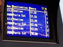 - à l’entrée de la gare ou dans le bâtiment voyageurs, où un afficheur présente les six prochains trains au départ, toutes directions confondues ;