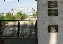 Plaques de la US Geological Survey montrant les niveaux atteints, de haut en bas, lors des inondations de 1993, 1844 et 1951 à Westport Landing (Kansas City) sur la rivière Missouri
