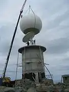 Radar météorologique de Vestkapp dans le comté de Sogn og Fjordane. Vue de la construction en 2009 lors de la pose du radôme à gauche et vue panoramique du site en 2014 où on voit que la tour en pierre naturelle s'agence avec un cairn.