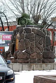 Monument du soulèvement de l'Arsenal devant la station de métro Arsenalna, avant qu'il ne soit modifié par des militants en juin 2019.