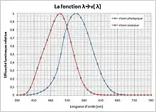 Dans un environnement plus obscur, la vision humaine ne distingue plus les couleurs, et la sensibilité spectrale relative est décalée vers le bleu. On parle de vision scotopique. Entre les deux domaines de luminosité, on parle de vision mésopique.