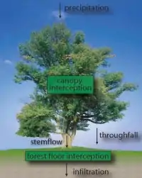L'analyse du devenir des précipitations arrivant sur un peuplement forestier montre qu'au début d'une averse, la majorité des gouttes d'eau sont interceptées par le couvert et plus ou moins rapidement évaporées, sans pénétrer dans les feuilles (évaporation selon le degré hydrométrique de l'air, selon la force du vent). Lorsque le feuillage est saturé, la distribution des eaux de pluie additionnelles se répartit, en plus de l'interception et de l'évapotranspiration, en[6] :