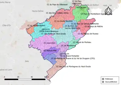 Au , le département du Doubs compte 15 établissements publics de coopération intercommunale à fiscalité propre dont le siège est dans le département (une communauté urbaine, une communauté d'agglomération et 13 communautés de communes). Par ailleurs 26 communes sont groupées dans 3 intercommunalités dont le siège est situé hors département (en Haute-Saône).
