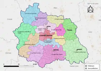 En 2015, le département du Puy-de-Dôme comptait 213 structures intercommunales, dont 44 établissements publics de coopération intercommunale (EPCI) à fiscalité propre dont le siège est dans le département : une communauté d'agglomération et 43 communautés de communes regroupant 469 des 470 communes du département[Note 1].