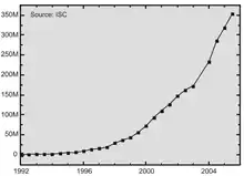 En janvier 1992, l’Internet Society (ISOC) voit le jour, dans le but de promouvoir et de coordonner les développements sur Internet. En 1993, la National Science Foundation (NSF) mandate une compagnie pour enregistrer les noms de domaine. À la fin des années 1990, des sociétés pionnières comme Yahoo!, Amazon, eBay, Netscape Communications, et AOL voient leur valeur en bourse monter en flèche, ce qui se finit par le krach boursier de 2001-2002.