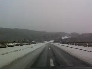 Entre les sorties 3 et 7, l'I-91 peut devenir plutôt dangereuse l'hiver, dû aux nombreuses courbes et pentes abruptes. Cette illustration est plus précisément située à la hauteur de la sortie 6, au nord de Bellows Falls.