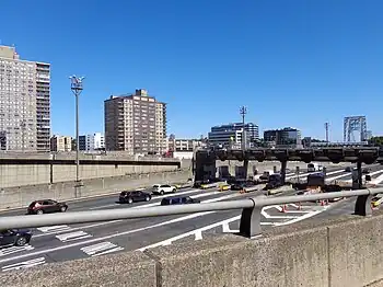 | ~73,00 | ~117,50 | En direction nord, l'autoroute se divise en deux sections distinctes, soit les voies intérieure (gauche) menant directement vers le pont George-Washington (Express Lanes) (Upper Level) ainsi que les voies extérieures (droite) menant vers les autres sorties et le Lower Level du pont; jonction de ces voies direction sud | |||