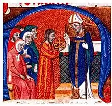 Dans le royaume d'Aragon, la pratique du couronnement apparait en 1204 avec le couronnement de Pierre II à Rome par Innocent III sous la forme d'un couronnement « impérial »[15]. Le pape fulmine l'année suivante une bulle permettant au roi d'Aragon d'être couronné à Saragosse par l'archevêque de Tarragone, mais sous la condition de l'accord du Saint-Siège[16]. Si Jacques Ier cherche à réduire l'emprise pontificale et déclare avoir obtenu son royaume par la conquête sur les musulmans, son fils Pierre III d'Aragon décida tout de même d'avoir un couronnement, mais sans demander au préalable l'accord de la papauté[15].