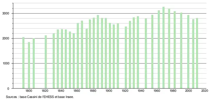 L'évolution du nombre d'habitants est connue à travers les recensements de la population effectués dans la commune depuis 1793. À partir du , les populations légales des communes sont publiées annuellement dans le cadre d'un recensement qui repose désormais sur une collecte d'information annuelle, concernant successivement tous les territoires communaux au cours d'une période de cinq ans. Pour les communes de moins de 10 000 habitants, une enquête de recensement portant sur toute la population est réalisée tous les cinq ans, les populations légales des années intermédiaires étant quant à elles estimées par interpolation ou extrapolation[5]. Pour la commune, le premier recensement exhaustif entrant dans le cadre du nouveau dispositif a été réalisé en 2005[6],[Note 2].