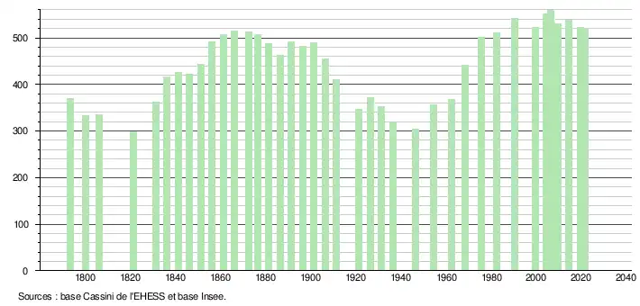 L'évolution du nombre d'habitants est connue à travers les recensements de la population effectués dans la commune depuis 1793. Pour les communes de moins de 10 000 habitants, une enquête de recensement portant sur toute la population est réalisée tous les cinq ans, les populations légales des années intermédiaires étant quant à elles estimées par interpolation ou extrapolation[28]. Pour la commune, le premier recensement exhaustif entrant dans le cadre du nouveau dispositif a été réalisé en 2004[29].