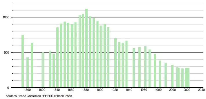 L'évolution du nombre d'habitants est connue à travers les recensements de la population effectués dans la commune depuis 1793. Pour les communes de moins de 10 000 habitants, une enquête de recensement portant sur toute la population est réalisée tous les cinq ans, les populations légales des années intermédiaires étant quant à elles estimées par interpolation ou extrapolation[17]. Pour la commune, le premier recensement exhaustif entrant dans le cadre du nouveau dispositif a été réalisé en 2008[18].