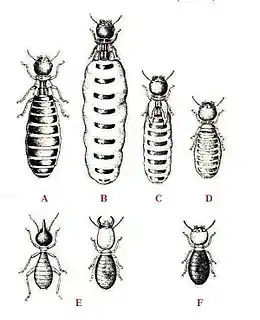 Les sociétés de termites comportent des individus neutres ou stériles, et des sexués. Les premiers n'ont pas d'ailes, ils sont roussâtres ou blancs, mous, avec la tête rousse, cornée, très développée chez certains d'entre eux qu'on appelle soldats et dont le rôle est de défendre la colonie, tandis que les individus à tête normale sont des ouvriers, chargés des travaux d'aménagement du nid et d'approvisionnement. Les « ouvriers » et les « soldats » sont aptères, les termites sexués sont ailés. Les ailes sont perdues après le vol nuptial (essaimage). Le mâle conserve ses dimensions normales, tandis que chez la femelle fécondée, l'abdomen rempli d’œufs devient énorme, acquérant cinquante ou soixante fois, quelquefois des centaines de fois, le volume du reste du corps.