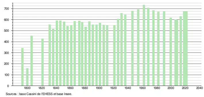 L'évolution du nombre d'habitants est connue à travers les recensements de la population effectués dans la commune depuis 1793. Pour les communes de moins de 10 000 habitants, une enquête de recensement portant sur toute la population est réalisée tous les cinq ans, les populations légales des années intermédiaires étant quant à elles estimées par interpolation ou extrapolation[56]. Pour la commune, le premier recensement exhaustif entrant dans le cadre du nouveau dispositif a été réalisé en 2008[57].