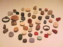 L'autre groupe de sources épigraphiques documentant l'Israël antique a été mis au jour en Palestine même. Il s'agit d'une grande variété d'inscriptions : sur roche, pierre, bronze, différents objets en argile, avant tout des tessons de poterie, les ostraca[22]. Les lots d'ostraca les plus importants sont ceux de Samarie et d'Arad datant du VIIIe siècle, et ceux de Lakish et d'Arad datés des environs de 600[23]. Il s'agit de documents comptables et administratifs, mais aussi de lettres. De nombreux sceaux ont également été mis au jour, fournissant une documentation abondante pour des études prosopographiques[24]. L'amulette trouvée à Ketef Hinnom et datant du Premier Temple est généralement considérée comme le plus ancien extrait biblique retrouvé.