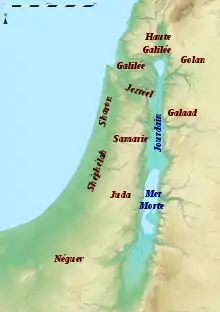 Le relief est plutôt montagneux et percé de vallées. C'est avant tout un espace de plateaux, très fragmentés, jouxtés à l'ouest par la large plaine côtière, dont celle de Sharon au nord qui fait partie du pays d'Israël (la côte sud étant un pays philistin), et à l'est par une dépression courte, fortement incisée et située en général bien en dessous du niveau de la mer, dans laquelle coule le cours d'eau majeur de la région, le Jourdain. Celui-ci relie deux étendues d'eau intérieures, le lac de Tibériade et la mer Morte. À l'est de la vallée du Jourdain s'étendent les plateaux de Transjordanie, dont une partie située au nord, le pays de Galaad et le Golan, était souvent intégrée à Israël. Les plateaux palestiniens consistent au nord en la région de Galilée, dont la partie la plus élevée, la Haute Galilée, culmine à plus de 1 200 mètres au mont Méron. Plus au sud, les plateaux des pays de Samarie et de Juda, les « hautes terres », sont moins élevés. Ils sont coupés par plusieurs failles (d'orientation généralement NNO-SSE), dont les plus importantes sont la vallée de Jezreel et celle de Beer-Sheva. Une autre sous-région peu élevée est la Shéphélah au sud-ouest de Juda, constituée de collines tendres ne dépassant pas les 450 mètres d'altitude. Les cours d'eau qui y coulent ne sont en général pas pérennes (les ouadis), mais de nombreuses sources et résurgences sont disséminées dans cet espace[26].