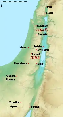 Quoi qu'il en soit de la monarchie unifiée, la seconde moitié du Xe siècle voit l'émergence de deux États dans l'arrière-pays palestinien : le royaume d'Israël au nord, et le royaume de Juda au sud. En dehors de ce qu'en disent les textes bibliques (les deux Livres des Rois et les Chroniques) dont la fiabilité historique est très discutée, les événements de cette période ne sont connus que par une poignée de textes. Le seul événement notable assuré pour cette période est une expédition du pharaon Sheshonq Ier (c. 945-924) mentionnée par plusieurs inscriptions et qui se retrouve dans le Premier Livre des Rois. Elle se serait conclue par la destruction de plusieurs villes palestiniennes. Cette campagne, du fait de son statut de seul événement majeur connu pour une période cruciale, a suscité beaucoup de débats et s'est vu attribuer diverses incidences politiques et phases de destructions de sites archéologiques, sans consensus faute de documentation suffisamment variée et d'une datation assurée[66].