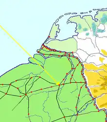 Carte localisant Tongres dans le réseau antique de voies, probables ou hypothétiques, au Bas-Empire[5], avec une frontière arbitraire entre la Gaule et les Germanies.