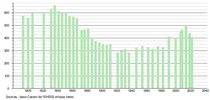 L'évolution du nombre d'habitants est connue à travers les recensements de la population effectués dans la commune depuis 1793. Pour les communes de moins de 10 000 habitants, une enquête de recensement portant sur toute la population est réalisée tous les cinq ans, les populations légales des années intermédiaires étant quant à elles estimées par interpolation ou extrapolation[20]. Pour la commune, le premier recensement exhaustif entrant dans le cadre du nouveau dispositif a été réalisé en 2008[21].