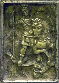 La composition s'ordonne autour de la plaque centrale qui la domine par son motif aussi bien que par sa qualité stylistique. Le motif sculpté représente la figure triomphante d'un empereur monté sur un cheval cabré. L'empereur tient dans la main droite la hampe d'une lance, la pointe fichée en terre, et dans la main gauche les rênes de son cheval. Derrière la lance est visible la figure d'un barbare, identifiable comme tel par sa chevelure et sa barbe broussailleuse, et surtout par ses vêtements : il porte un bonnet recourbé, similaire au bonnet phrygien, indication d'une origine orientale, une tunique à manches longues et des braies. Symbolisant un Perse ou un Scythe, il représente les peuples vaincus par l'empereur : c'est en signe de soumission qu'il touche la lance de la main droite et lève la main gauche.