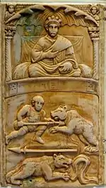 Le triomphe de l'empire byzantin est établi. Il a échappé au démantèlement de l'empire d'Occident[13]. Le centre de gravité a changé de zone, c'est désormais l'Orient qui règne. Le Ve siècle est marqué par l'emprise de la religion chrétienne qui enracine ses doctrines dans les pays conquis par elle. On assiste à une véritable innovation en matière d'iconographie et elle est commune à tout le bassin méditerranéen. Les figures des saints remplacent, sur les diptyques par exemple, celles des consuls ou même, pour la figure christologique, celle des empereurs. L'iconographie chrétienne puise ses formules iconographiques dans les modèles classiques.