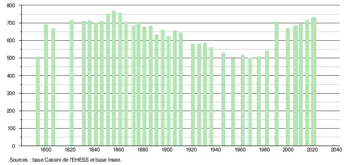 L'évolution du nombre d'habitants est connue à travers les recensements de la population effectués dans la commune depuis 1793. Pour les communes de moins de 10 000 habitants, une enquête de recensement portant sur toute la population est réalisée tous les cinq ans, les populations légales des années intermédiaires étant quant à elles estimées par interpolation ou extrapolation[27]. Pour la commune, le premier recensement exhaustif entrant dans le cadre du nouveau dispositif a été réalisé en 2005[28].