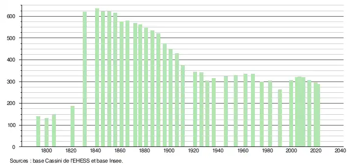 | L'évolution du nombre d'habitants est connue à travers les recensements de la population effectués dans la commune depuis 1793. Pour les communes de moins de 10 000 habitants, une enquête de recensement portant sur toute la population est réalisée tous les cinq ans, les populations légales des années intermédiaires étant quant à elles estimées par interpolation ou extrapolation[31]. Pour la commune, le premier recensement exhaustif entrant dans le cadre du nouveau dispositif a été réalisé en 2004[32]. En 2021, la commune comptait 287 habitants[Note 6], en diminution de 4,97 % par rapport à 2015 (Gers : +0,79 %, France hors Mayotte : +1,84 %). |
