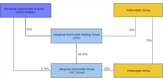 Le groupe Volkswagen détient une part de 75 % de Volkswagen Anhui tandis que le groupe JAC détient une part de 25 %. Le Groupe Volkswagen détenait également 50 % de JAC Holding Group (JAG), la société mère du Groupe JAC, ce qui signifie que le Groupe Volkswagen détient également une participation de 14,09 % du Groupe JAC. En conséquence, le pourcentage de propriété détenu par le Groupe Volkswagen dans Volkswagen Anhui atteint effectivement 78,52 %.