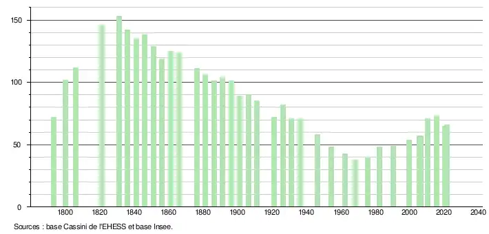 L'évolution du nombre d'habitants est connue à travers les recensements de la population effectués dans la commune depuis 1793. Pour les communes de moins de 10 000 habitants, une enquête de recensement portant sur toute la population est réalisée tous les cinq ans, les populations légales des années intermédiaires étant quant à elles estimées par interpolation ou extrapolation[29]. Pour la commune, le premier recensement exhaustif entrant dans le cadre du nouveau dispositif a été réalisé en 2005[30].