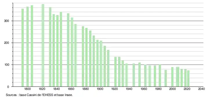 L'évolution du nombre d'habitants est connue à travers les recensements de la population effectués dans la commune depuis 1793. Pour les communes de moins de 10 000 habitants, une enquête de recensement portant sur toute la population est réalisée tous les cinq ans, les populations légales des années intermédiaires étant quant à elles estimées par interpolation ou extrapolation[17]. Pour la commune, le premier recensement exhaustif entrant dans le cadre du nouveau dispositif a été réalisé en 2007[18].