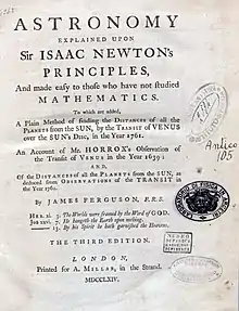 James Ferguson (né le à Keith – mort le à Édimbourg) est un mécanicien et astronome écossais[1]. Il donna à Londres des leçons publiques de physique, publia des tables et des calculs astronomiques, et composa plusieurs ouvrages qui obtinrent un grand succès.
