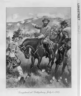 Les actions de Longstreet lors de la bataille de Gettysburg deviendront la pièce maîtresse d'une controverse durable[153]. Longstreet arrive sur le champ de bataille vers 16 h 30 le premier jour, le , avec plusieurs heures d'avance sur ses troupes. Robert Lee n'a pas l'intention de combattre avant que son armée ne soit entièrement concentrée, mais le hasard et les décisions d'Ambrose Powell Hill, dont les troupes sont les premières à être engagées, provoquent l'affrontement. La bataille du premier jour se solde par une victoire confédérée. Deux corps d'armée de l'Union sont chassés par Richard Stoddert Ewell et Ambrose Powell Hill de leurs positions au nord de Gettysburg et traversent la ville pour prendre des positions défensives sur les hauteurs au sud. Lors de sa rencontre avec Lee, Longstreet s'inquiète de la solidité des positions défensives de l'Union sur les hauteurs et préconise un mouvement stratégique autour de leur flanc gauche, afin de « sécuriser un bon terrain entre lui et sa capitale », ce qui oblige vraisemblablement George Meade à attaquer les positions défensives érigées par les Confédérés[154],[155],[156]. Au lieu de cela, Lee s'exclame : « Si l'ennemi est là demain, je l'attaquerai ». Longstreet répond : « S'il est là demain, c'est parce qu'il veut que vous l'attaquiez »[157]. Lee, ragaillardi par le succès de son armée ce jour-là, refuse à nouveau. Longstreet suggère un assaut immédiat sur les positions fédérales, mais Lee insiste pour attendre John Bell Hood et Lafayette McLaws, qui marchent vers Gettysburg. Longstreet envoie un messager sur la route de Cashtown pour les presser. Ils finissent par bivouaquer à environ 6,4 kilomètres derrière les lignes. George Pickett effectue un travail d'arrière-garde à Cashtown et n'est pas prêt à bouger avant le matin. Une bévue majeure se produit alors lorsque Ewell ne parvient pas à s'emparer des hauteurs de Cemetery Hill après avoir reçu l'ordre de le faire « si possible » par Lee[158],[159],[160].