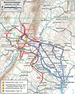 Après le succès confédéré à la seconde bataille de Bull Run, Lee, qui détient l'initiative stratégique, décide de porter la guerre dans le Maryland afin de soulager la Virginie et d'inciter les nations étrangères à venir en aide aux Confédérés. Longstreet soutient ce plan et dit dans ses mémoires : « La situation exigeait une action […] et il n'y avait qu'une seule ouverture : à travers le Potomac »[102],[103]. Ses hommes traversent le Maryland le 6 septembre et arrivent à Frederick le lendemain, commençant ainsi la campagne du Maryland[102]. Lors de la bataille d'Antietam le 17 septembre, plutôt que d'engager ses forces en une seule fois, George McClellan lance une série d'attaques partielles sur les troupes confédérées à différents endroits tout au long de la journée tout en gardant une grande partie de ses troupes, y compris l'ensemble du Ve corps en réserve. À l'aube, la division de John Bell Hood sur la gauche confédérée est repoussée par un assaut des corps de Joseph Hooker et de Joseph K. Mansfield jusqu'à ce qu'ils soient renforcés par des hommes du commandement de Thomas Jonathan Jackson. D'autres troupes des deux camps affluent bientôt dans les combats, qui font rage pendant trois heures[104],[105]. Au centre du champ de bataille, la division de Daniel Harvey Hill défend une position d'environ 550 mètres dominée par un chemin de charrettes creusé. La position est naturellement forte, d'autant plus que des morceaux de bois d'une clôture en bois sont empilées au sommet du fossé, et les hommes de Hill repoussent fermement deux charges successives des divisions de l'Union de William H. French et d'Israel Bush Richardson. Hill subit des pertes importantes et Longstreet envoie la division de Richard Heron Anderson, composée de 3 500 hommes, en renfort. Anderson est blessé et remplacé par Roger Atkinson Pryor. À la demande de Pryor, Longstreet envoie un soutien d'artillerie en réponse aux tirs des canons de l'Union sur les Confédérés qui se trouvent sur la route depuis l'autre côté de l'Antietam Creek. Il ordonne également un mouvement de flanc d'environ 900 soldats répartis dans plusieurs régiments et dirigés par le colonel John Rogers Cooke (en). Les troupes de l'Union arrêtent l'avancée de Cooke. Un combat intense s'ensuit et Cooke se retire après avoir épuisé ses munitions. Un ordre erroné permet aux troupes de l'Union d'ouvrir une brèche dans la position confédérée au niveau du chemin, mais les lignes confédérées sont stabilisées[106].