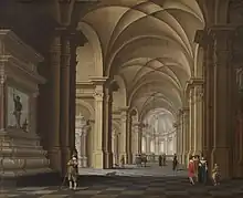 Les personnages qui peuvent être d'Antoine Palamedèsz (1601-1673) sont souvent représentés de petite taille ce qui donne une plus grande envolée à l'architecture.