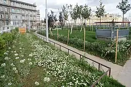 Il compte des pelouses accessibles, des massifs plantés et un jardin partagé. Il est agrémenté de 68 arbres, dont 46 fruitiers, et propose également une fontaine d'eau potable, un espace solarium et une aire de jeux pour les enfants[1].