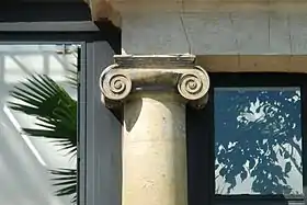 Chacune des baies latérales est flanquée d'une colonne et d'un pilastre à chapiteau ionique[1] portant un linteau en forme d'entablement classique.