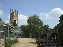 Serres du jardin botanique, avec vue sur la tour du Magdalen College à l'arrière-plan