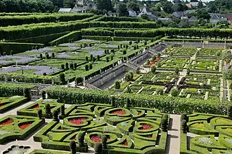 Parc du château de Villandry en France avec ses jardins ornementaux géométriques et potagers.