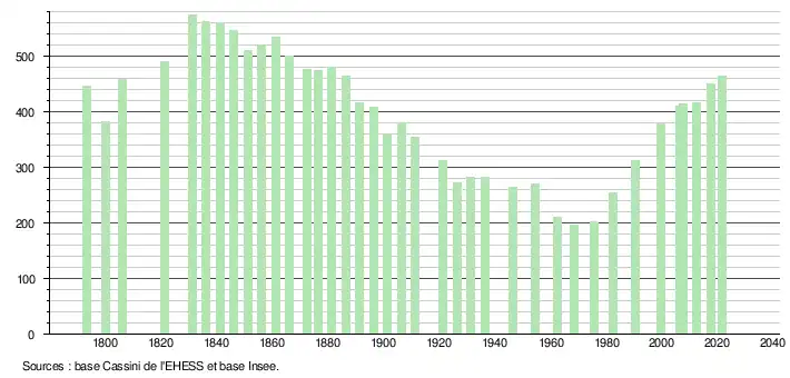 L'évolution du nombre d'habitants est connue à travers les recensements de la population effectués dans la commune depuis 1793. Pour les communes de moins de 10 000 habitants, une enquête de recensement portant sur toute la population est réalisée tous les cinq ans, les populations légales des années intermédiaires étant quant à elles estimées par interpolation ou extrapolation[24]. Pour la commune, le premier recensement exhaustif entrant dans le cadre du nouveau dispositif a été réalisé en 2007[25].
