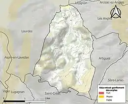 La commune est vulnérable au risque de mouvements de terrains constitué principalement du retrait-gonflement des sols argileux[32]. Cet aléa est susceptible d'engendrer des dommages importants aux bâtiments en cas d’alternance de périodes de sécheresse et de pluie. La totalité de la commune est en aléa faible (44,5 % au niveau départemental et 48,5 % au niveau national). Sur les 126 bâtiments dénombrés sur la commune en 2019, aucun n'est en aléa moyen ou fort, à comparer aux 75 % au niveau départemental et 54 % au niveau national. Une cartographie de l'exposition du territoire national au retrait gonflement des sols argileux est disponible sur le site du BRGM[33],[Carte 3].