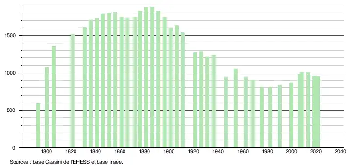 | L'évolution du nombre d'habitants est connue à travers les recensements de la population effectués dans la commune depuis 1793. Pour les communes de moins de 10 000 habitants, une enquête de recensement portant sur toute la population est réalisée tous les cinq ans, les populations légales des années intermédiaires étant quant à elles estimées par interpolation ou extrapolation[26]. Pour la commune, le premier recensement exhaustif entrant dans le cadre du nouveau dispositif a été réalisé en 2008[27]. En 2021, la commune comptait 956 habitants[Note 2], en diminution de 4,3 % par rapport à 2015 (Gironde : +6,88 %, France hors Mayotte : +1,84 %). |
