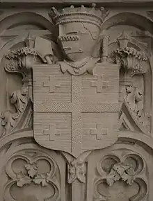D'azur à la croix d'or cantonnée de 4 croisettes du même[5]