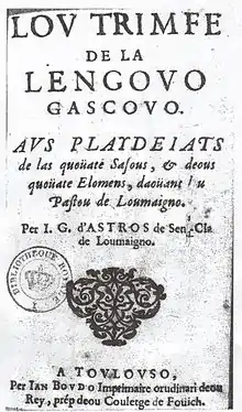 - J. G. d'Astros, Lou trimfe de la lengouo gascouo, Toulouso, Ian Boudo, 1642, reprint Nimes, C. Lacour éditeur, 2003.