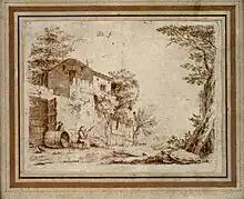 - Temple de la Sibylle à Tivoli, plume, encre noire et lavis d'encre de Chine, H. 0,293 ; L. 0,189 m[19]. Paris, Beaux-Arts de Paris[20]. D'abord vendue comme étant de la main d'Hubert Robert, cette feuille donne une interprétation du site de Tivoli inondé de soleil par des contrastes entre les réserves de papier et les nuances de lavis gris. Le traitement des arbres et les personnages sur la route en contrebas évoquent les maîtres hollandais.