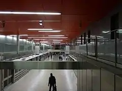 Du côté de la ligne B, c'est la méthode espagnole qui est utilisée ; la station est équipée de trois quais pour deux voies : le quai central sert à l'embarquement des passagers, les quais latéraux sont utilisés pour le débarquement. Les portes de la rame s'ouvrent des deux côtés, toutefois, afin d'inciter les voyageurs à descendre du côté prévu, la signalisation visuelle embarquée indique un seul côté de descente et les portes du quai central s'ouvrent avec un retardement par rapport à celles du quai latéral. Ce système permet de réduire le temps d'arrêt en station, étant donné que le flux d'échange de voyageurs y est l'un des plus importants du réseau. De plus, les quais comptent douze portes, ce qui permet de recevoir des rames de 52 m à quatre voitures.