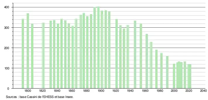 L'évolution du nombre d'habitants est connue à travers les recensements de la population effectués dans la commune depuis 1793. Pour les communes de moins de 10 000 habitants, une enquête de recensement portant sur toute la population est réalisée tous les cinq ans, les populations légales des années intermédiaires étant quant à elles estimées par interpolation ou extrapolation[31]. Pour la commune, le premier recensement exhaustif entrant dans le cadre du nouveau dispositif a été réalisé en 2004[32].