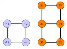 - le spoiler choisit x1, le duplicateur répond par y1, le spoiler choisit y4, le duplicateur répond par x4. Les éléments choisis dans la première structure sont déconnectés (il n'y a pas d'arête entre x1 et x4), de même pour ceux de la seconde structure. Le duplicateur gagne.