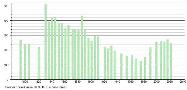 L'évolution du nombre d'habitants est connue à travers les recensements de la population effectués dans la commune depuis 1793. Pour les communes de moins de 10 000 habitants, une enquête de recensement portant sur toute la population est réalisée tous les cinq ans, les populations légales des années intermédiaires étant quant à elles estimées par interpolation ou extrapolation[16]. Pour la commune, le premier recensement exhaustif entrant dans le cadre du nouveau dispositif a été réalisé en 2006[17].