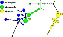Un exemple de ce qu'on appelle la metro map pour le jeu de données Iris[4]. Seule une petite proportion des Iris virginica est mélangée avec les Iris versicolor. Tous les autres échantillons de différentes espèces Iris appartiennent à des nœuds différents.